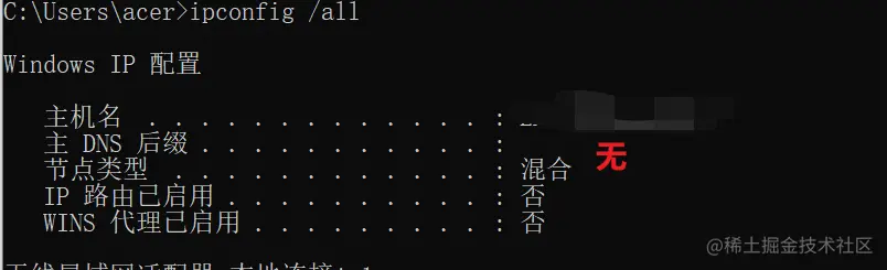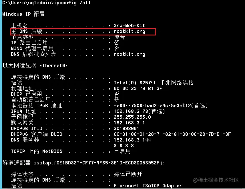 ipconfig /all 判断存在域-dns 有域的有dns后缀,无域的无dns后缀