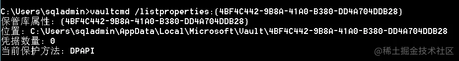 列出GUID为{4BF4C442-9B8A-41A0-B380-DD4A704DDB28}的保管库(vault)的属性,包括文件位置、包含的凭据数量、保护方法: