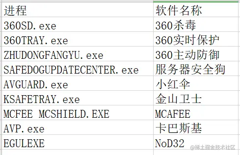 域内的较件和杀毒软件应该是一致的,常见的杀毒软件进程如下: