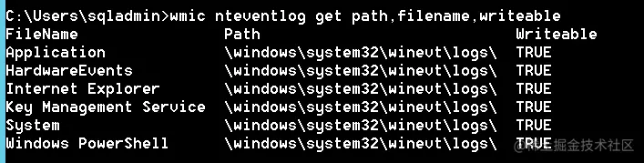 wmic nteventlog get path,filename,writeable查看是否能修改删除日志