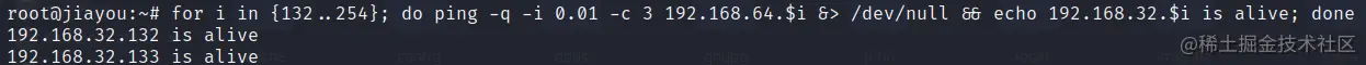 for i in {132..254}; do ping -q -i 0.01 -c 3 192.168.64.i &> /dev/null && echo 192.168.64.i is alive; done