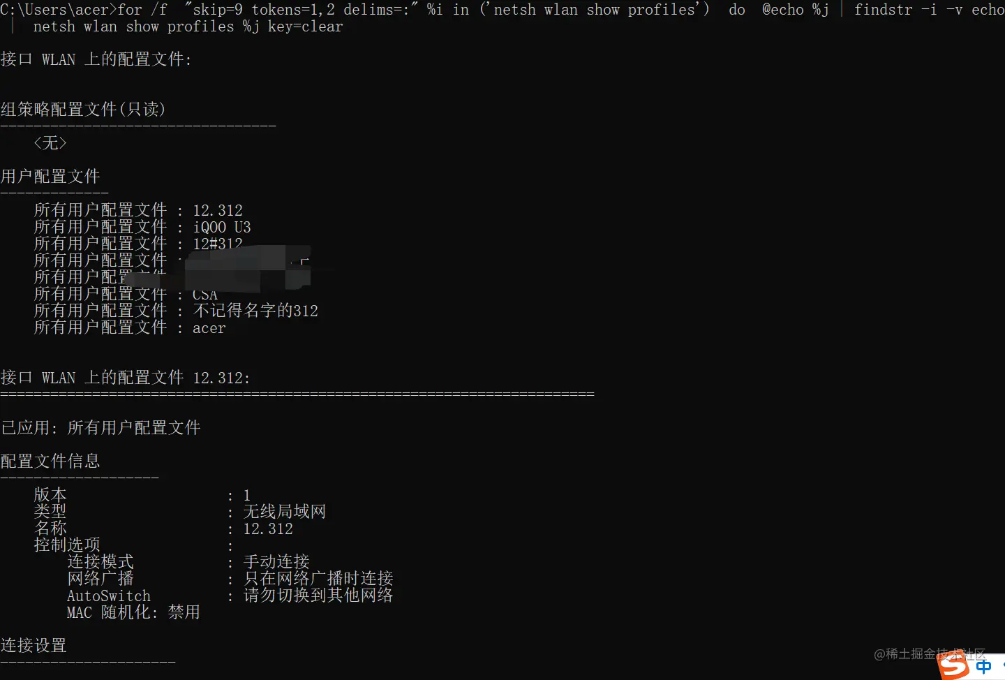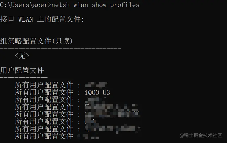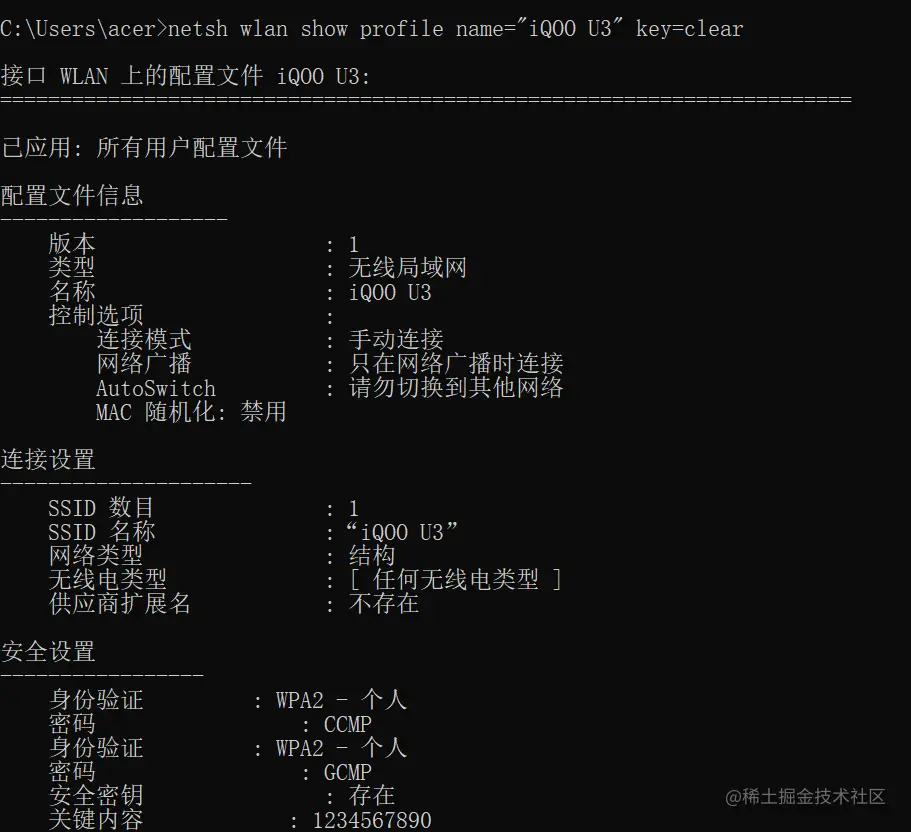 netsh wlan show profile name="iQOO U3" key=clear获取iQOO U3中的WiFi密码