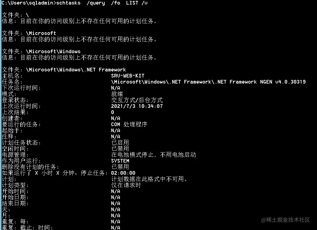 schtasks /query /fo LIST /v查看目标主机上的计划任务信息