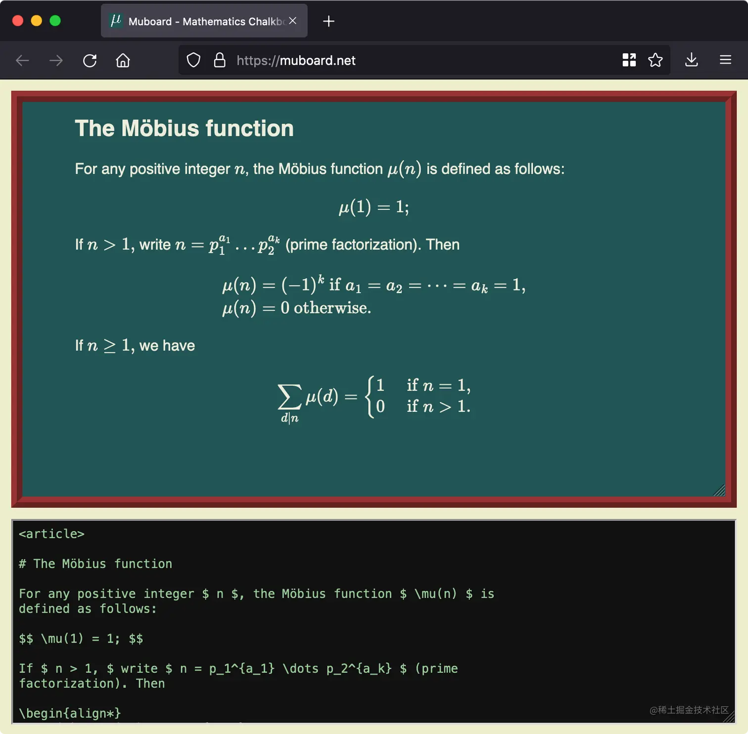 Muboard 是一款开源的数学白板工具,可通过编写 Markdown 和 LaTex,在 Web 页面进行展示,可用于演讲、教学、会议等多种场景。
