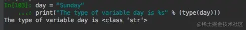 可以看到,day的类型是str,字符串类型,我们可以使用内置的type()方法来查看对象的类型