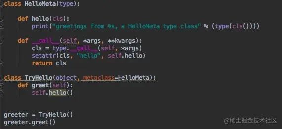 我们可以看到,我们并没有在TryHello里面定义hello的方法,但是这个方法被自动执行了。因为TryHello使用了HelloMeta作为元类,所以在调用hello方法时,没有发生错误。所以,通过上面的例子,我们可以想到,我们可以使用元类为由元类创建的类自动新增一些方法。所以,元类的一个好处就是,在你还没有意识到的时候,神奇的事情就发生了。最后,如果你的时间不是很紧张,并且又想快速的提高,最重要的是不怕吃苦,建议你可以联系维:762459510 ,那个真的很不错,很多人进步都很快,需要你不怕吃苦哦!大家可以去添加上看一下~