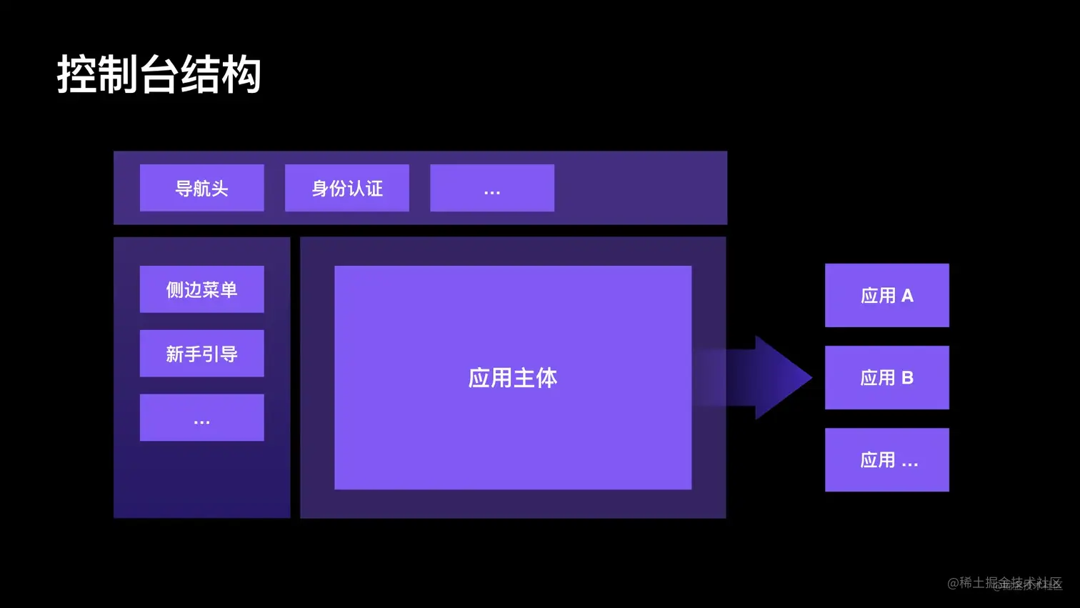 例如有这样一个应用,其中顶部的导航头、身份认证和左边的侧边栏在内的所有部分加起来就是我们的主应用,或者说是框架应用。而中间那个框也就是应用主体,应用 body 部分,它就是我们接入的一系列子应用,它可能是应用 a、应用 b 、应用 c 等等一系列的应用。我们把这一系列的应用一起集成到了一个大的控制台应用里面,这就是微前端技术的一个典型应用场景。