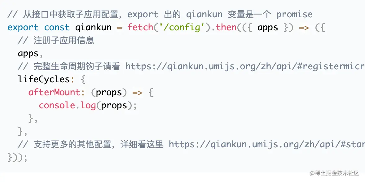你想在生命周期期间加一些自定义逻辑,可以在子应用的 入口文件里导出 qiankun 对象,并实现每一个生命周期钩子