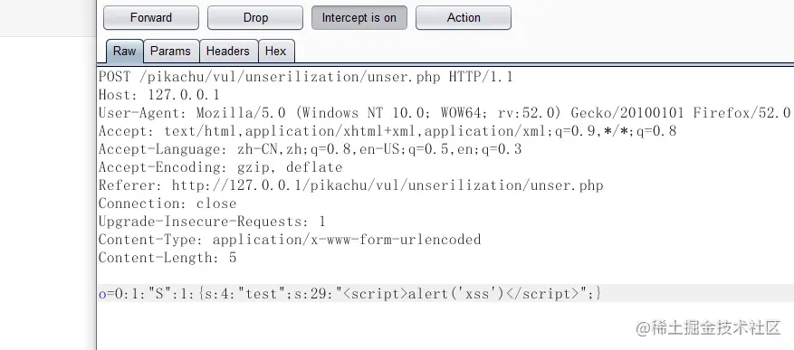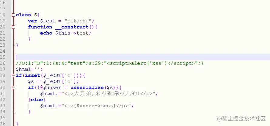 可以看到他是以post传参,它对传入的数据赋值给s在对s进行反序列化,如果不能放序列化就会把“大兄弟,来点劲爆点儿的!“写入到网页中,如果能就会用反序列化后的对象访问test成员变量,把它输出发到网页上,这里test变量值可控,就可以构造js代码构造XSS漏洞,这里仅仅只是一个输出,如何写了其他功能,如写了,读取等那么就有更大的危害了。