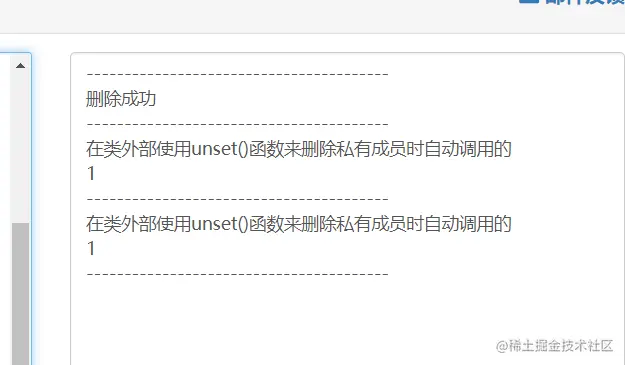 <?phpclass Person{ public $sex; private $name; private $age; public function \_\_construct($name, $age,$sex) { $this->name = $name; $this->age = $age; $this->sex = $sex; } public function \_\_unset($content) { echo "在类外部使用unset()函数来删除私有成员时自动调用的\\n"; echo isset($this->$content); }}$person = new Person("李四", 11,"男"); // 初始赋值echo "----------------------------------------\\n";unset($person->sex);echo "删除成功\\n";echo "----------------------------------------\\n";unset($person->name);echo "\\n";echo "----------------------------------------\\n";unset($person->age);echo "\\n";echo "----------------------------------------\\n";?>