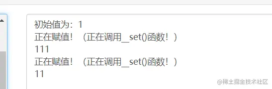 <?phpclass Test{ public function shell(){ echo $this->A; } protected $A=1; public function \_\_set($name,$value){ echo "正在赋值!(正在调用\_\_set()函数!)\\n"; $this->A=$value; }}$a = new Test();echo "初始值为:";$a->shell();echo "\\n";$a->A = 111;// 在这里对A这个保护成员进行赋值,所以调用了\_\_set()函数$a->shell();echo "\\n";$a->AA = 11;//它对这个不存在的成员变量进行了赋值,所以调用了\_\_set()函数$a->shell();?>