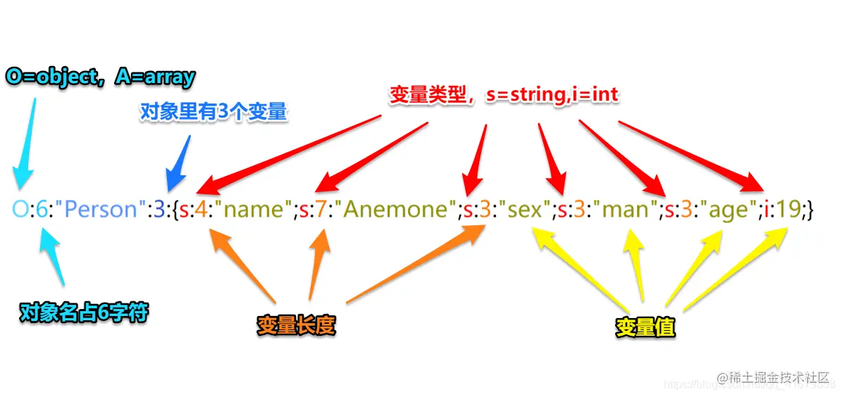 这里O是代表序列号的为对象,2就是代表这个对象它又两个字符,第三个就是代表具体的类值了,到了第二个2就是代表他所序列化的成员变量为2个,再之后大括号里面的就是具体的序列化的变量了,其中到第一个分号为止是代表第一个序列化的成员变量,s是代表为字符串,4位变量长度,冒号里面的就是具体的值了,再到第二个分号就是代表这个变量的具体值得数据类型,个数和具体值了,后面的就依次类推。但是数据类型有很多具体序列化之后,分别用什么表示这里我推荐大家看下这篇文章:blog.csdn.net/phphot/arti… etails/1754911