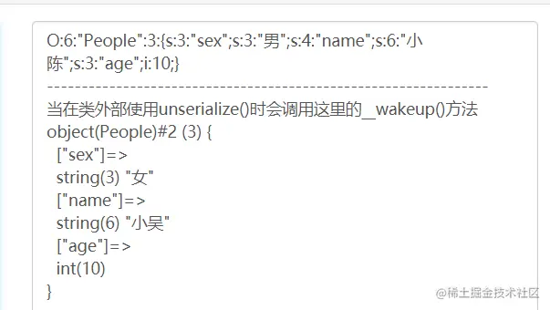 <?phpclass People{ public $sex; public $name; public $age; public function \_\_construct($name, $age, $sex) { $this->name = $name; $this->age = $age; $this->sex = $sex; } public function \_\_wakeup() { echo "当在类外部使用unserialize()时会调用这里的\_\_wakeup()方法\\n"; $this->name = '小吴'; $this->sex = '女'; }}$p = new People('小陈',10,'男'); $D=serialize($p);echo $D;echo "\\n";echo "----------------------------------------------------------------\\n";var\_dump(unserialize(serialize($p)));?>