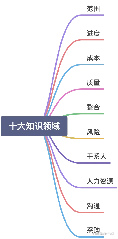 根据PMBOK内容,其主要体系如下,五大过程组+10大知识领域,每个领域都有其对应点过程组