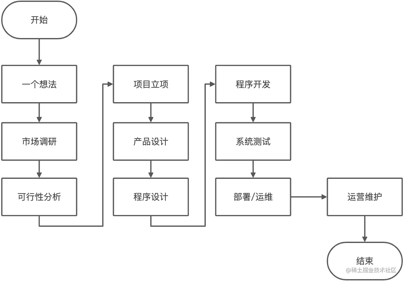 以上流程基本上是绝大多数公司产品开发的流程了,不同组织结构的公司可能各个环节所执行的粗细粒度不一样而已,但大体方向应该不会有太大偏差。流程中“项目立项”-->...-->“部署运维”为项目管理过程