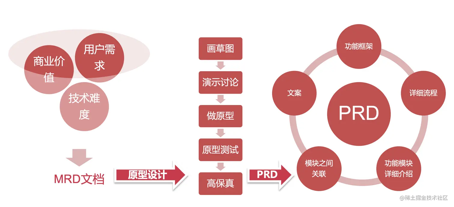 如上图所示,在产品设计过程中,输入是MRD文档,也就是《市场需求文档》提前对用户需求,商业价值以及技术难度等做了提前的推算和分析。最后确定立项才正式进入项目开发环节,项目过程中即对产品进行原型设计,原型测试以及高保真等方面的设计,其目的在于能够更好的与用户或是需求方描述满足需求的产品方案。另一方面在于后期可以与研发团队有一个比较好的衔接,一般会形成PRD文档。在PRD文档中主要描述产品的整体功能框架,详细流程,以及各个功能模块的关联关系等内容,形成文案的方式,交付给研发团队,其目的是让研发团队指导产品想做什么。