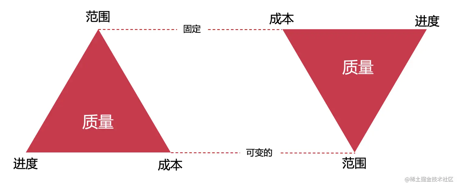 左边为传统项目,邮编为敏捷项目;传统项目中,范围,进度,成本就是一个铁三角。任何一边变更都会引起其他方面的变更,如果不然质量将无法得到有效保证。