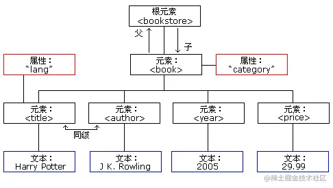 <year>2005</year>,元素节点<year>,拥有一个值为 "2005" 的文本节点。"2005" 不是