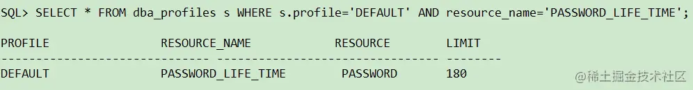 SELECT * FROM dba_profiles s WHERE s.profile='DEFAULT' AND resource_name='PASSWORD_LIFE_TIME';