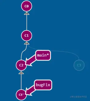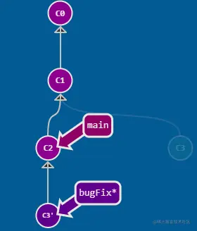 (如上图)提交记录 C3 依然存在(树上那个半透明的节点),而 C3' 是我们 Rebase 到 main 分支上的 C3 的副本。