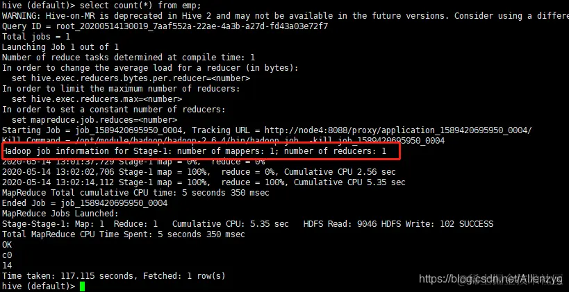 hive (default)> select count(*) from emp;