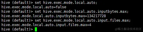 | 用户可以通过设置 hive.exec.mode.local.auto 的值为 true,来让 Hive 在适当的时候自动启动这个优化。//开启本地 mr,默认为falseset hive.exec.mode.local.auto=true;//设置 local mr 的最大输入数据量,当输入数据量小于这个值时采用 local mr 的方式,默认为 134217728,即 128Mset hive.exec.mode.local.auto.inputbytes.max=50000000;//设置 local mr 的最大输入文件个数,当输入文件个数小于这个值时采用 local mr 的方式,默认为 4set hive.exec.mode.local.auto.input.files.max=10;查看以上3个参数的默认值: |