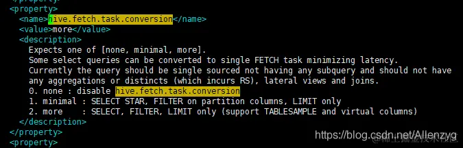 在 hive-default.xml.template 文件中 hive.fetch.task.conversion 默认是 more,老版本 hive默认是 minimal,该属性修改为 more 以后,在全局查找、字段查找、limit 查找等都不走mapreduce。