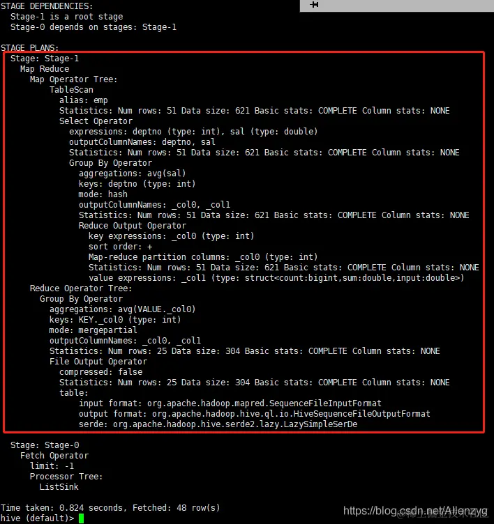 | 截图太长了,贴出来吧hive (default)> explain extended select deptno, avg(sal) avg_sal from emp group by > deptno;OKExplainSTAGE DEPENDENCIES: Stage-1 is a root stage Stage-0 depends on stages: Stage-1STAGE PLANS: Stage: Stage-1 Map Reduce Map Operator Tree: TableScan alias: emp Statistics: Num rows: 51 Data size: 621 Basic stats: COMPLETE Column stats: NONE GatherStats: false Select Operator expressions: deptno (type: int), sal (type: double) outputColumnNames: deptno, sal Statistics: Num rows: 51 Data size: 621 Basic stats: COMPLETE Column stats: NONE Group By Operator aggregations: avg(sal) keys: deptno (type: int) mode: hash outputColumnNames: _col0, _col1 Statistics: Num rows: 51 Data size: 621 Basic stats: COMPLETE Column stats: NONE Reduce Output Operator key expressions: _col0 (type: int) null sort order: a sort order: + Map-reduce partition columns: _col0 (type: int) Statistics: Num rows: 51 Data size: 621 Basic stats: COMPLETE Column stats: NONE tag: -1 value expressions: _col1 (type: structcount:bigint,sum:double,input:double) auto parallelism: false Path -> Alias: hdfs://node4:9000/user/hive/warehouse/emp [emp] Path -> Partition: hdfs://node4:9000/user/hive/warehouse/emp Partition base file name: emp input format: org.apache.hadoop.mapred.TextInputFormat output format: org.apache.hadoop.hive.ql.io.HiveIgnoreKeyTextOutputFormat properties: EXTERNAL TRUE bucket_count -1 columns empno,ename,job,mgr,hiredate,sal,comm,deptno columns.comments columns.types int:string:string:int:string:double:double:int field.delim file.inputformat org.apache.hadoop.mapred.TextInputFormat file.outputformat org.apache.hadoop.hive.ql.io.HiveIgnoreKeyTextOutputFormat location hdfs://node4:9000/user/hive/warehouse/emp name default.emp numFiles 1 numRows 0 rawDataSize 0 serialization.ddl struct emp { i32 empno, string ename, string job, i32 mgr, string hiredate, double sal, double comm, i32 deptno} serialization.format serialization.lib org.apache.hadoop.hive.serde2.lazy.LazySimpleSerDe totalSize 621 transient_lastDdlTime 1588930267 serde: org.apache.hadoop.hive.serde2.lazy.LazySimpleSerDe input format: org.apache.hadoop.mapred.TextInputFormat output format: org.apache.hadoop.hive.ql.io.HiveIgnoreKeyTextOutputFormat properties: EXTERNAL TRUE bucket_count -1 columns empno,ename,job,mgr,hiredate,sal,comm,deptno columns.comments columns.types int:string:string:int:string:double:double:int field.delim file.inputformat org.apache.hadoop.mapred.TextInputFormat file.outputformat org.apache.hadoop.hive.ql.io.HiveIgnoreKeyTextOutputFormat location hdfs://node4:9000/user/hive/warehouse/emp name default.emp numFiles 1 numRows 0 rawDataSize 0 serialization.ddl struct emp { i32 empno, string ename, string job, i32 mgr, string hiredate, double sal, double comm, i32 deptno} serialization.format serialization.lib org.apache.hadoop.hive.serde2.lazy.LazySimpleSerDe totalSize 621 transient_lastDdlTime 1588930267 serde: org.apache.hadoop.hive.serde2.lazy.LazySimpleSerDe name: default.emp name: default.emp Truncated Path -> Alias: /emp [emp] Needs Tagging: false Reduce Operator Tree: Group By Operator aggregations: avg(VALUE._col0) keys: KEY._col0 (type: int) mode: mergepartial outputColumnNames: _col0, _col1 Statistics: Num rows: 25 Data size: 304 Basic stats: COMPLETE Column stats: NONE File Output Operator compressed: false GlobalTableId: 0 directory: hdfs://node4:9000/tmp/hive/root/d235e2aa-ac01-4ab7-b21a-d3bb5eb6008d/hive_2020-05-14_16-18-31_519_5922595460120425873-1/-mr-10001/.hive-staging_hive_2020-05-14_16-18-31_19_5922595460120425873-1/-ext-10002 NumFilesPerFileSink: 1 Statistics: Num rows: 25 Data size: 304 Basic stats: COMPLETE Column stats: NONE Stats Publishing Key Prefix: hdfs://node4:9000/tmp/hive/root/d235e2aa-ac01-4ab7-b21a-d3bb5eb6008d/hive_2020-05-14_16-18-31_519_5922595460120425873-1/-mr-10001/.hive-staging_hive_200-05-14_16-18-31_519_5922595460120425873-1/-ext-10002/ table: input format: org.apache.hadoop.mapred.SequenceFileInputFormat output format: org.apache.hadoop.hive.ql.io.HiveSequenceFileOutputFormat properties: columns _col0,_col1 columns.types int:double escape.delim \ hive.serialization.extend.additional.nesting.levels true serialization.escape.crlf true serialization.format 1 serialization.lib org.apache.hadoop.hive.serde2.lazy.LazySimpleSerDe serde: org.apache.hadoop.hive.serde2.lazy.LazySimpleSerDe TotalFiles: 1 GatherStats: false MultiFileSpray: false Stage: Stage-0 Fetch Operator limit: -1 Processor Tree: ListSinkTime taken: 0.151 seconds, Fetched: 123 row(s) |