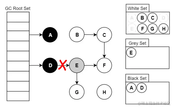 GC Roots直接引用的对象标记为灰色集合; - 如果判断灰色集合中的对象不存在子引用,则将其放入黑色集合,若存在子引用对象,则将其所有的子引用对象存放到灰色集合,当前对象放入黑色集合。