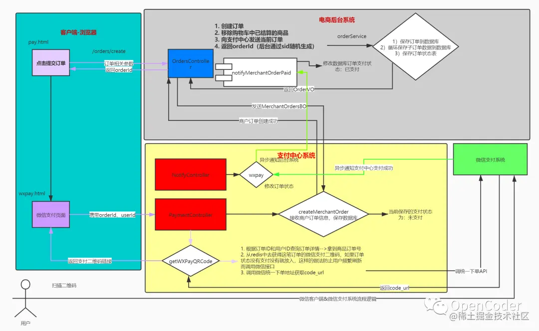 而对于我们的系统开发来讲整个过程应该如何进行呢?我们先来看一张之前开发我做的一张微信支付的全流程图: