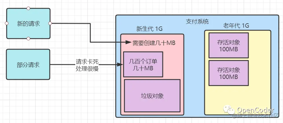 首先通过上述的流程图我们知道,用户提交支付请求,到订单系统提交真正的支付订单到支付系统,那么这个时候支付系统才算是真正开始工作以及处理,那么每天有一百万个支付请求对应着支付系统就会接收到一百万个支付订单,从而要去存储和处理这一百万个支付订单,那么说的更直白点就是我们的JVM内存中每天会有百万个支付订单对象需要创建(每个订单对象包含用户信息、商品信息、支付渠道信息、支付时间、价格等各类信息的汇总),因此我们聚焦在JVM的管理中来看,每一天我们的JVM内存中就会有上百万个支付订单对象的创建和销毁,那么我们需要思考以下几个核心问题: