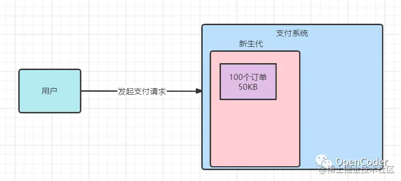 那么结合以上两点分析我们可以知道,系统每1秒会来100个支付订单,而每个支付订单的创建需要1秒,那也就是1秒过后,就会在内存中产生50KB的垃圾对象,因为1秒过后这100个对象就没人引用了,成为新生代中的垃圾对象了。