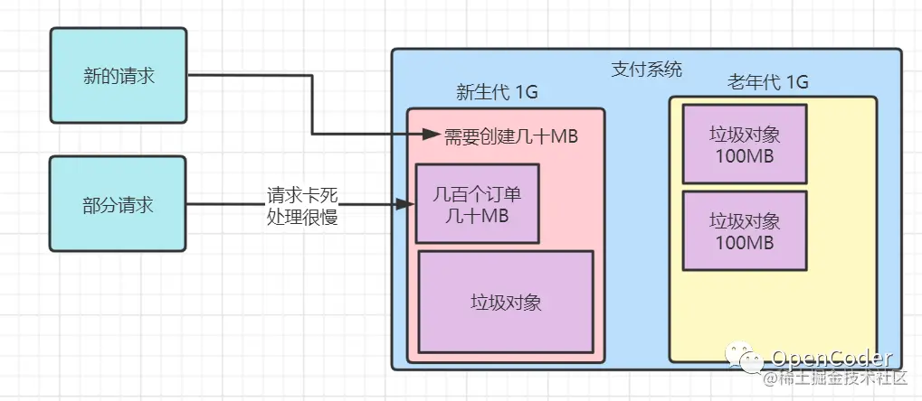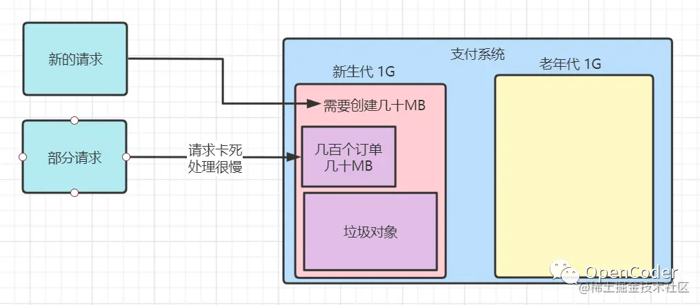 之前我们计算过每一秒产生的对象是在1MB,那遇到大促的时候,每一秒的内存占用有可能就能达到10MB甚至几十MB(得往大一点预估不要考虑刚刚好),并且这个时候还有个问题就是,以前差不多1秒能处理完我们100个订单,但是现在1000个订单1秒是肯定处理不完的,刚才也分析过,CPU、线程、内存都吃紧,系统性能也会跟着不稳定,那1000个订单至少需要几秒甚至几十秒才可能处理完毕。