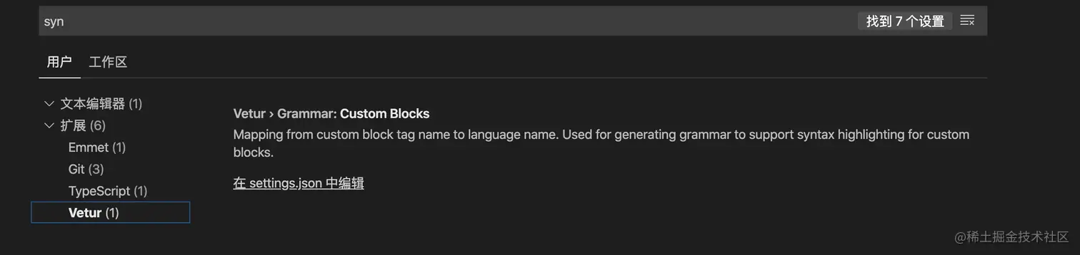 首选项-> 设置 -> 输入(syn)进行搜索 -> 在最底下的Vetur中选择在settings.json中编辑