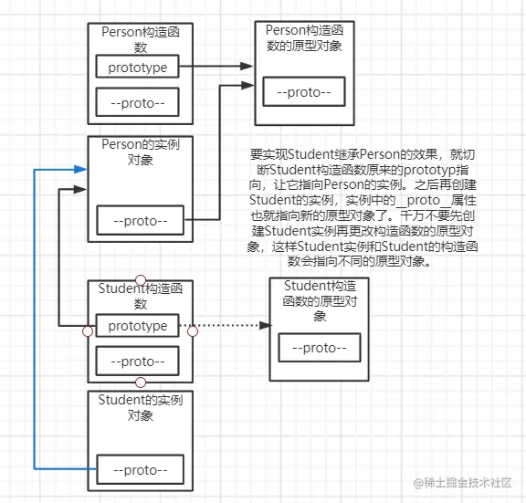 Student.prototype=new Person() //只改写原型对象,不传参,给父类型传参的工作交给call()