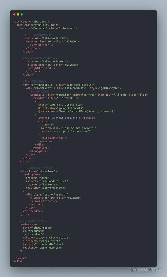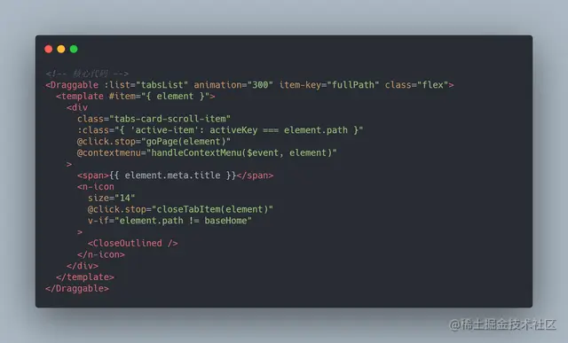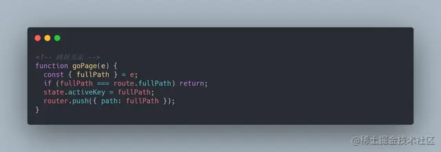 这里分析一下完整思路,标签是通过从 watch route.fullPath 然后 从route 中,组装一个简易tab结构,保存在vuex中,跳转代码如下