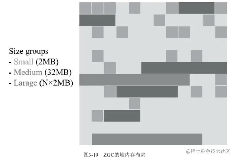 和Shenandoah收集器一样,ZGC使用了region作为堆内存的布局但是ZGC的region具备大中小三个容量的region:
