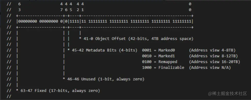 为了更好的理解,我们来看一下官方源代码中给出的图,说白了染色指针就是用了一部分地址空间来存放一些对象的标记信息,同时在对象移动之后也能保证对象引用的同步移动,0-41 这 42 位就是正常的地址,所以说 ZGC 最大支持 4TB (理论上可以16TB)的内存,因为就只用了42 位用来表示地址,这也决定了他不能进行指针压缩和不支持32位的操作系统,42-45位表示的是标志位,他们就是用来记录对象引用的,同时会指向同一个对象。