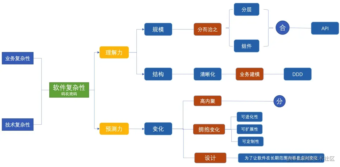 《DDD应对复杂》中也提到复杂的来源,对于软件复杂性以及应对方案,特地总结画了一幅图