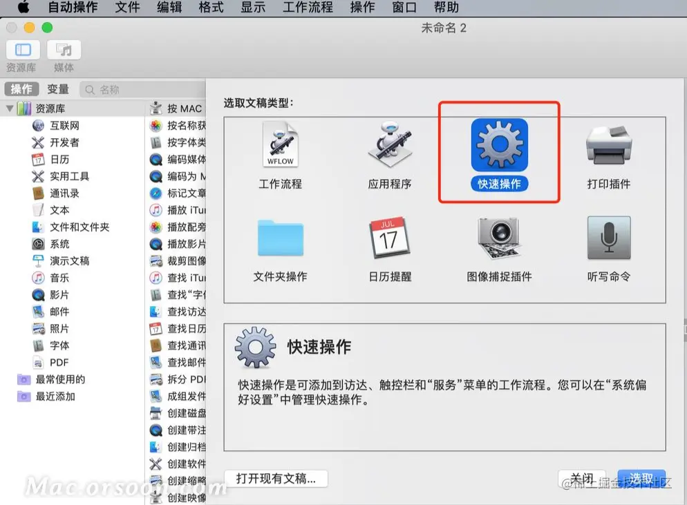 1.打开「Automator」,新建文件,选择「快速操作」。