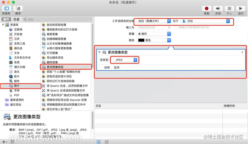 2.从左侧选择「照片」-「更改图像类型」,拖拽至右侧的 流程区域,顶部选择文件类型和想支持的位置,此处选择 图像文件 和 Finder。更改图像类型 选择 JPEG ,支持 BMP/JPEG/PNG/TIFF,看你需要。