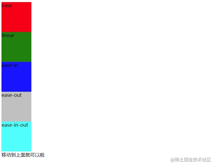 | transition-timing-function | 规定过渡效果的时间曲线。默认是 ease。 | 3 |