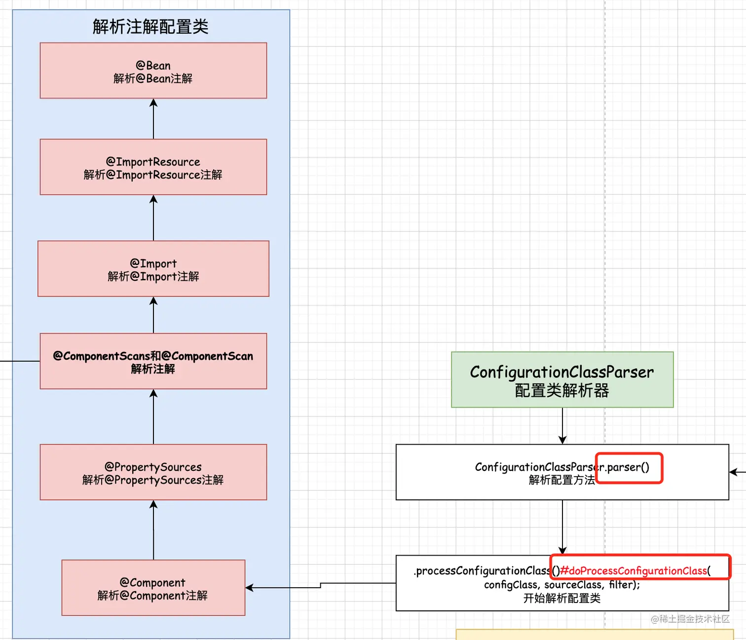 解析配置类, 看看配置类是否含有如上标记的注解, 如果有, 则调用响应的返回对其进行解析,处理.