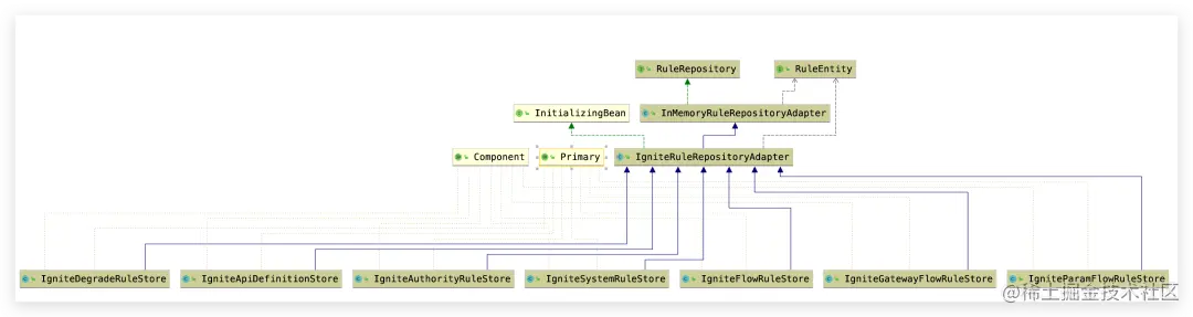 默认的控制台中,每次查询到规则信息都存储在内存中由InMemoryRuleRepositoryAdapter实现。而在集群方案中,我们则将所有的规则数据存储到对应的缓存(流控,降级,系统等)中。为此我们重写了InMemoryRuleRepositoryAdapter,实现了其所有接口方法,让所有的操作都基于分布式缓存实现。该实现类为IgniteRuleRepositoryAdapter。同时每个规则都继承IgniteRuleRepositoryAdapter。结构关系如下图: