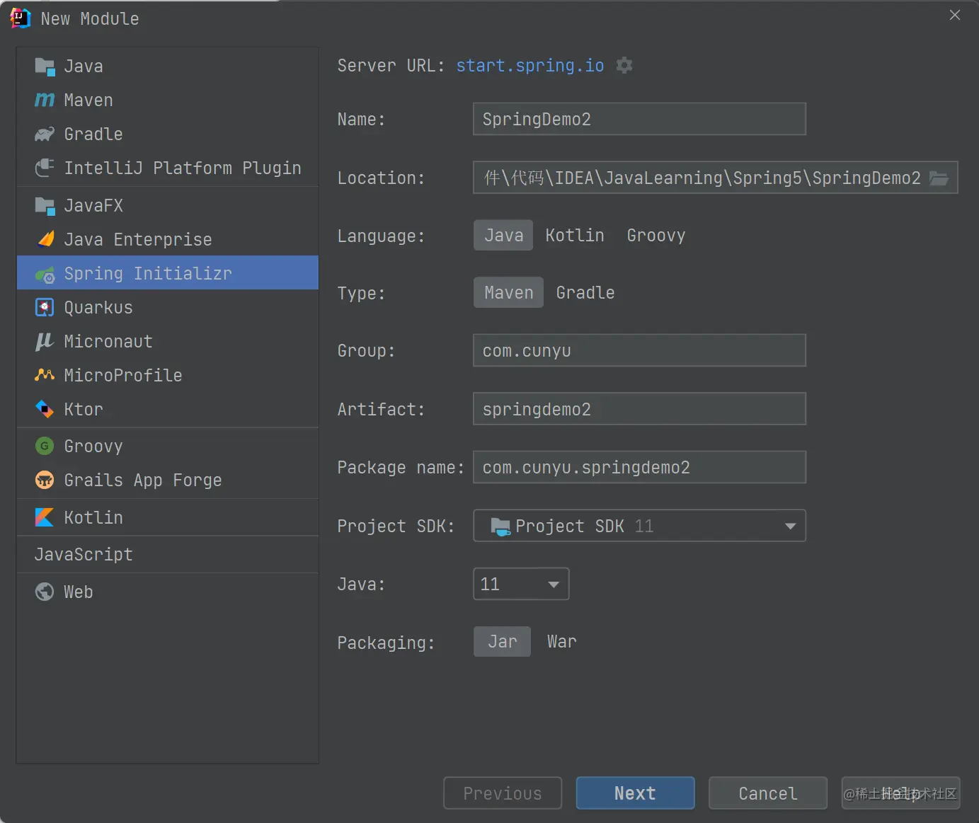 Spring Initializer,并填下 Maven 坐标相关信息;
