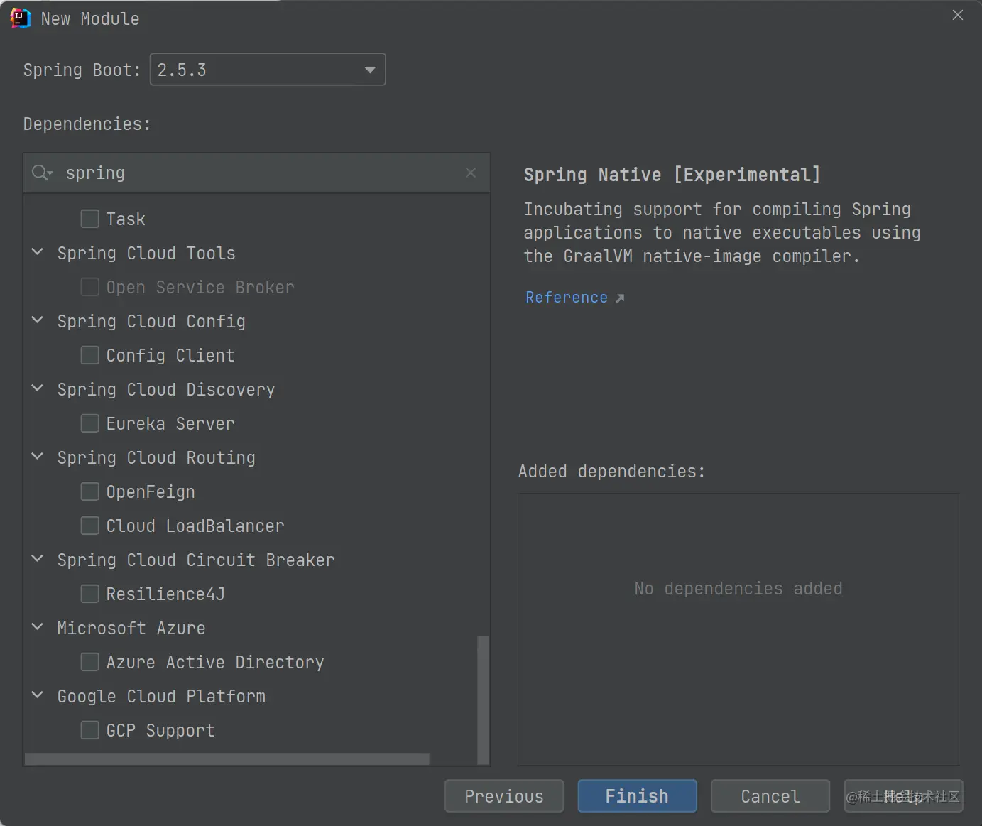 对比通过 Maven 创建的方式,这里所添加的依赖有所不同。这是因为这种方式实际上创建的是 SpringBoot 项目,而 SpringBoot 的依赖和 Spring 有所不同,但 SpringBoot 能够实现 Spring 所具有的功能,所以这里不用再去重复添加 Spring 的相关依赖。