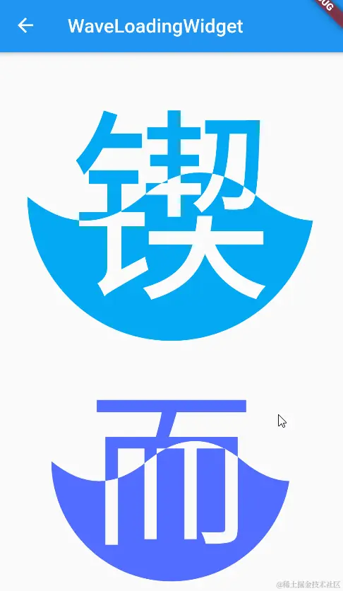 - 波浪的起伏线将嵌入的文本分为上下两种颜色,上边的文本颜色和 waveColor 保持一致,下边的文本颜色以 downTextColor 命名,文本的上下分割线一直在动态变化中