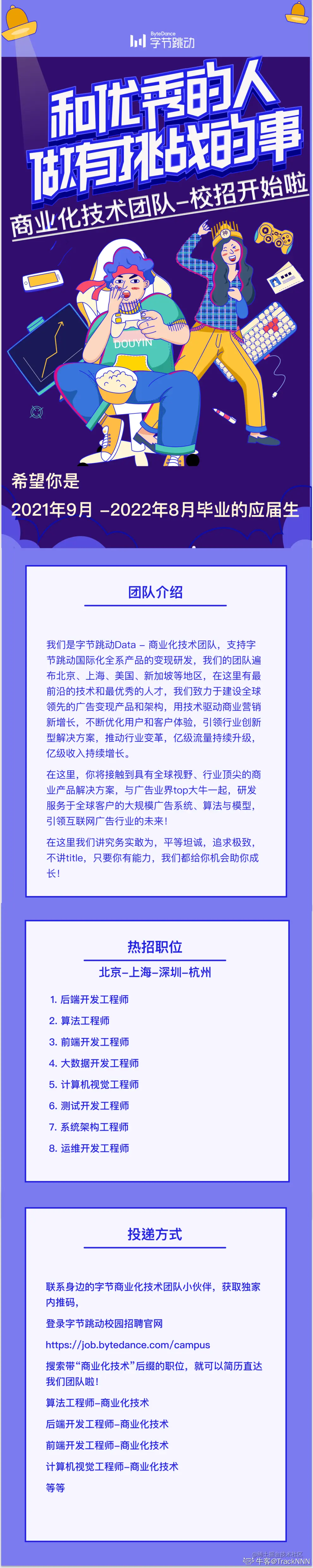- 商业化(广告)技术团队,支持字节跳动全系产品的商业变现研发,拥有复杂的算法,精湛的业务,希望追求更大舞台的你一起加入,展示你的才华!