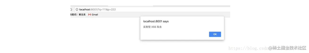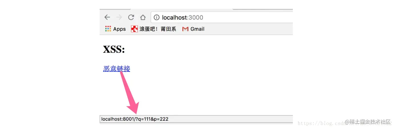 恶意链接的地址指向了 localhost:8001/?q=111&p=222。然后,我再启一个简单的 Node 服务处理恶意链接的请求:
