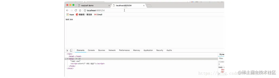 当用户点击提交按钮将输入信息提交到服务端时,服务端通过 userInput 变量保存了输入内容。当用户通过 http://localhost:8001/${id} 访问时,服务端会返回与 id 对应的内容(本示例简化了处理)。如果用户输入了恶意脚本内容,则其他用户访问该内容时,恶意脚本就会在浏览器端执行: